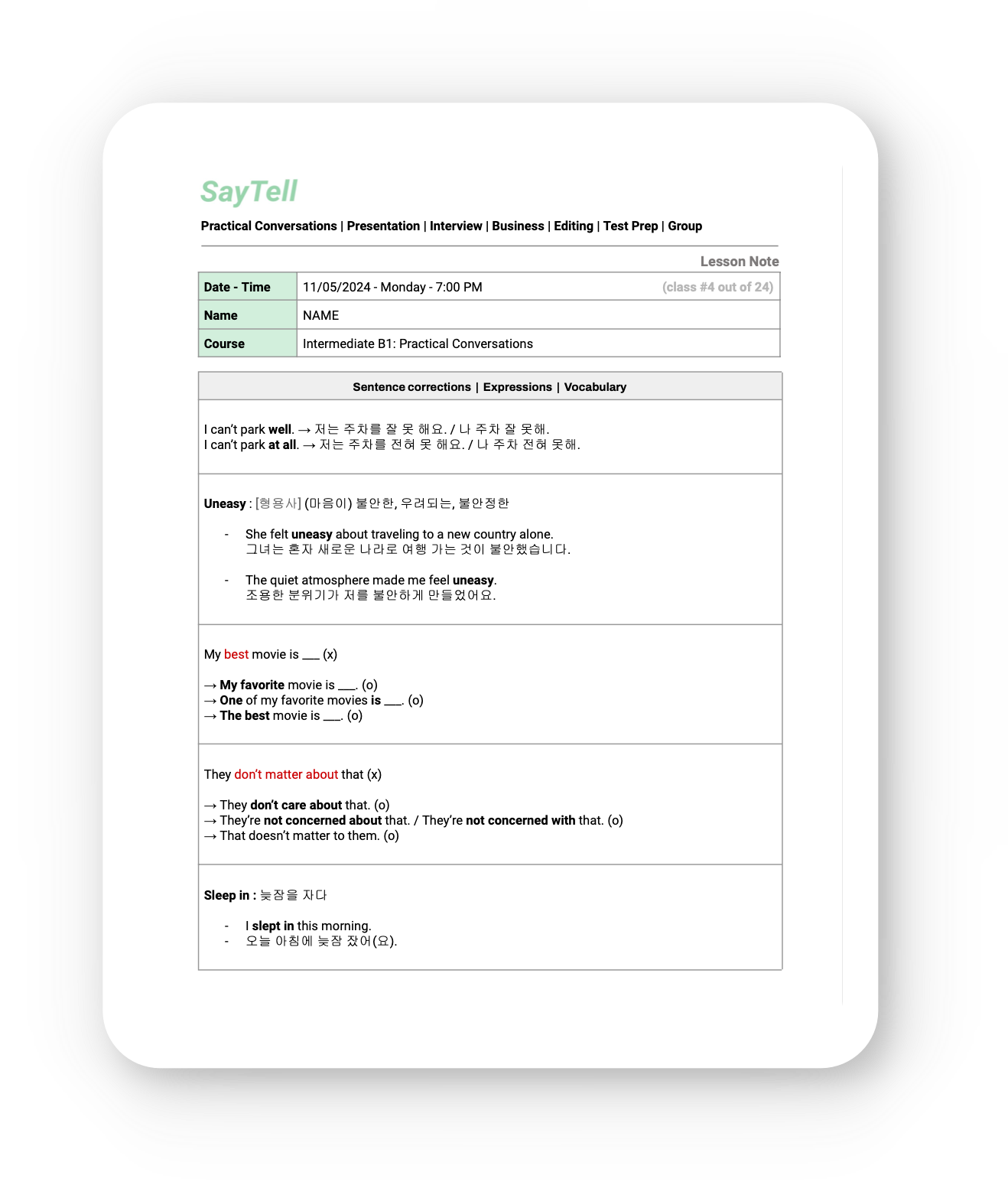 Review your lesson notes full of new information from each class: sentence corrections, grammar and pronunciation points, new vocabulary, class materials.
